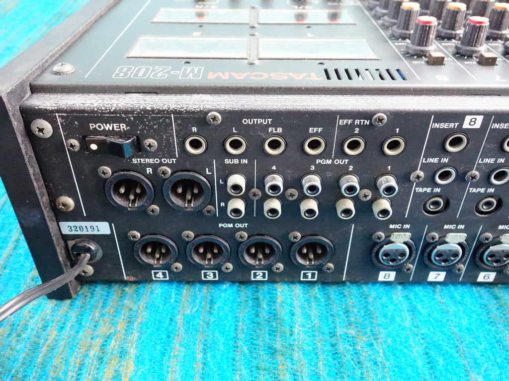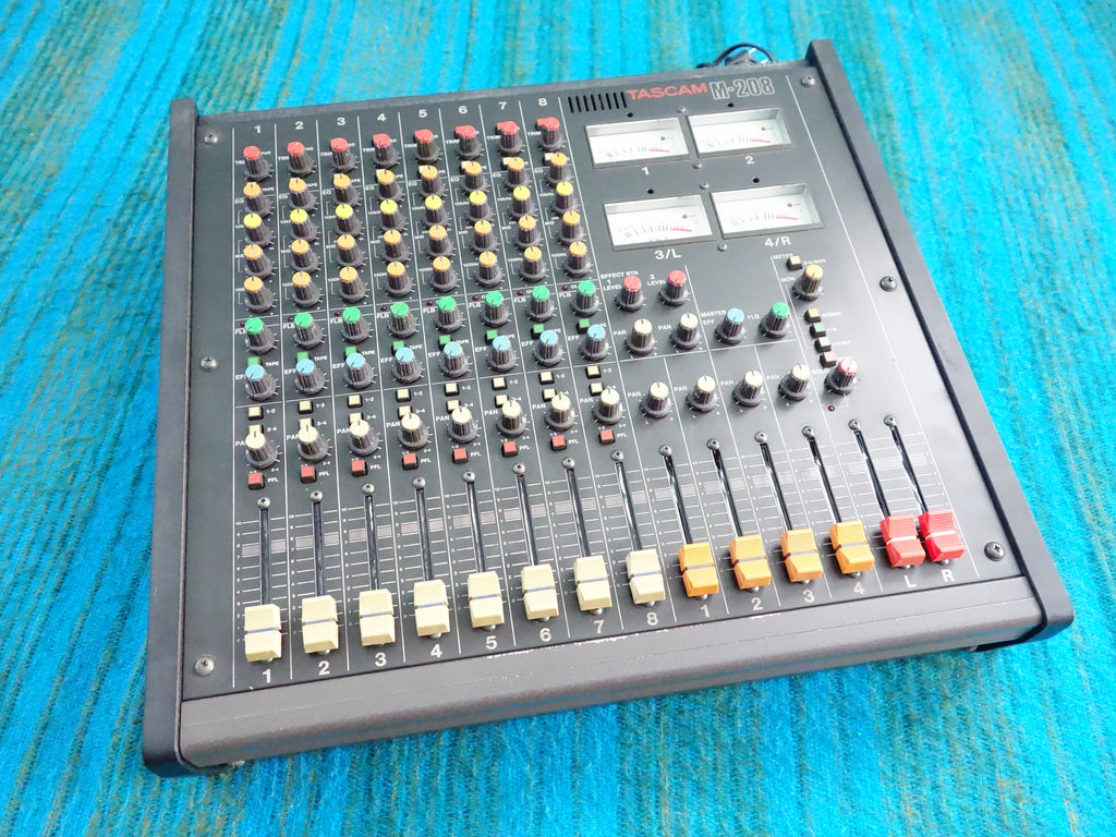 This vintage Tascam M-208 mixer is fully functional and in excellent working condition, despite some cosmetic wear such as scratches.
